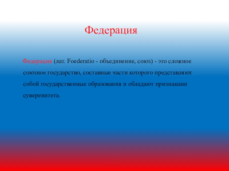 Федерация (лат. Foederatio - объединение, союз) - это сложное союзное государство, составные части которого представляют собой государственные образования и обладают признаками суверенитета.