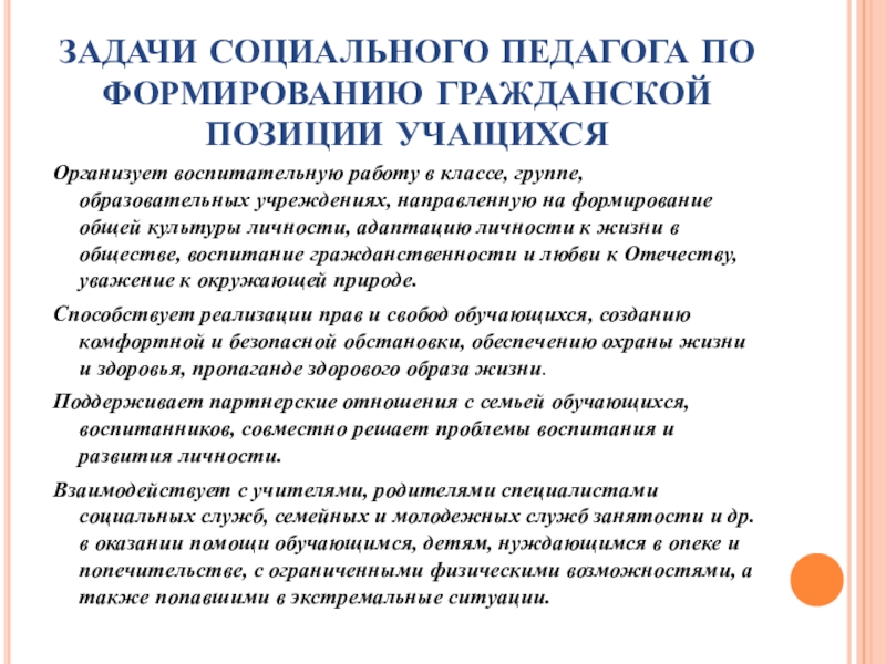 Слайд 16ЗАДАЧИ СОЦИАЛЬНОГО ПЕДАГОГА ПО ФОРМИРОВАНИЮ ГРАЖДАНСКОЙ ПОЗИЦИИ УЧАЩИХСЯ