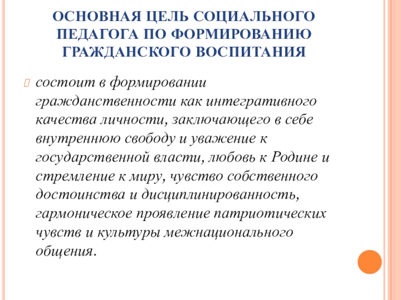 Слайд 7ОСНОВНАЯ ЦЕЛЬ СОЦИАЛЬНОГО ПЕДАГОГА ПО ФОРМИРОВАНИЮ ГРАЖДАНСКОГО ВОСПИТАНИЯ
