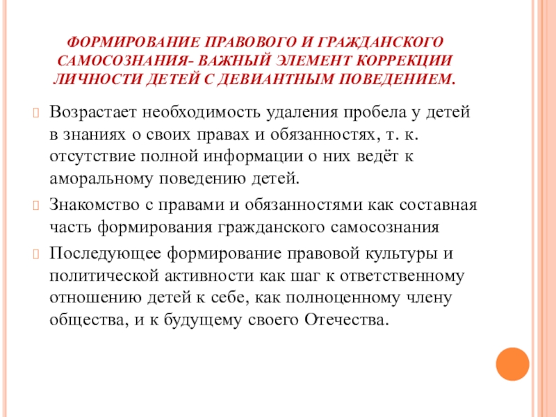 ФОРМИРОВАНИЕ ПРАВОВОГО И ГРАЖДАНСКОГО САМОСОЗНАНИЯ- ВАЖНЫЙ ЭЛЕМЕНТ КОРРЕКЦИИ ЛИЧНОСТИ ДЕТЕЙ С