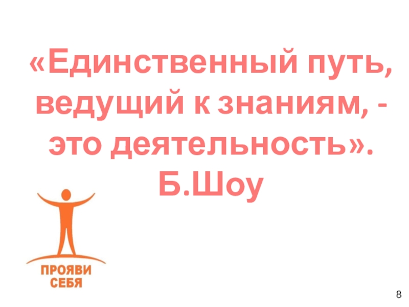 Слайд 9«Единственный путь, ведущий к знаниям, - это деятельность».