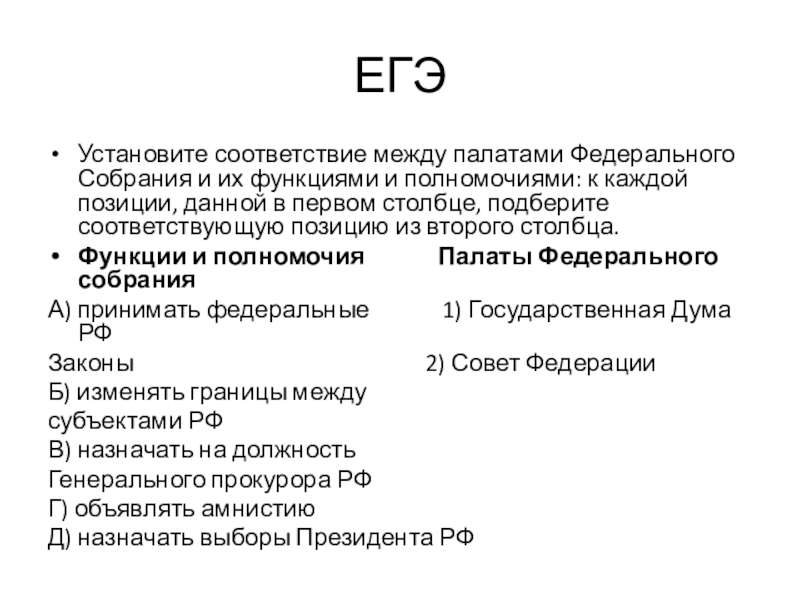Установите соответствие между палатами Федерального Собрания и их функциями и полномочиями: