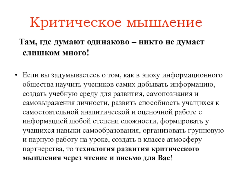 Если вы задумываетесь о том, как в эпоху информационного общества научить учеников самих добывать информацию, создать учебную среду для развития, самопознания и самовыражения личности, развить способность учащихся к самостоятельной аналитической и оценочной работе с информацией любой степени сложности, формировать у учащихся навыки самообразования, организовать групповую и парную работу на уроке, создать в классе атмосферу партнерства, то технология развития критического мышления через чтение и письмо для Вас!