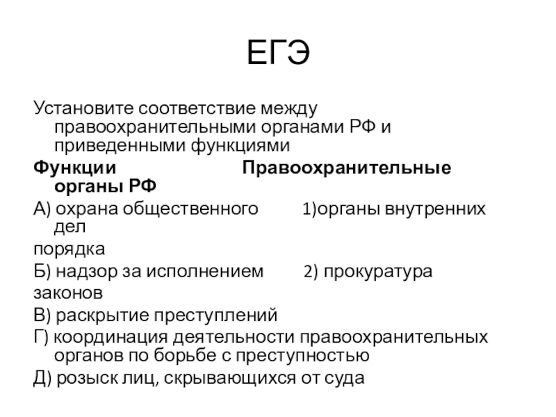Установите соответствие между правоохранительными органами РФ и приведенными функциями