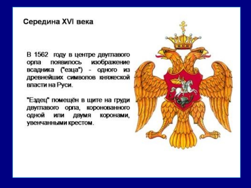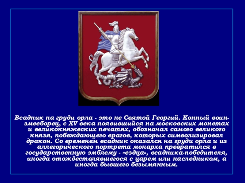 с XV века появившийся на московских монетах и великокняжеских печатях, обозначал самого великого князя, побеждающего врагов, которых символизировал дракон. Со временем всадник оказался на груди орла и из аллегорического портрета монарха превратился в государственную эмблему - «ездца», всадника-победителя, иногда отождествлявшегося с царем или наследником, а иногда бывшего безымянным.
