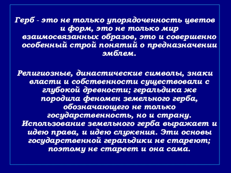 Герб - это не только упорядоченность цветов и форм, это не только мир взаимосвязанных образов, это и