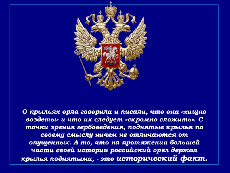 их следует «скромно сложить». С точки зрения гербоведения, поднятые крылья по своему смыслу ничем не отличаются от опущенных. А то, что на протяжении большей части своей истории российский орел держал крылья поднятыми, - это исторический факт.
