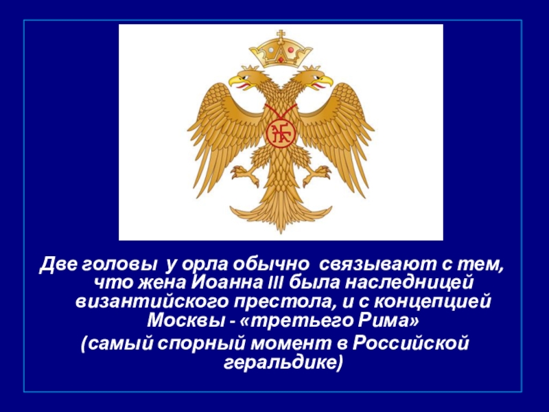 Две головы у орла обычно связывают с тем, что жена Иоанна III была наследницей византийского престола, и