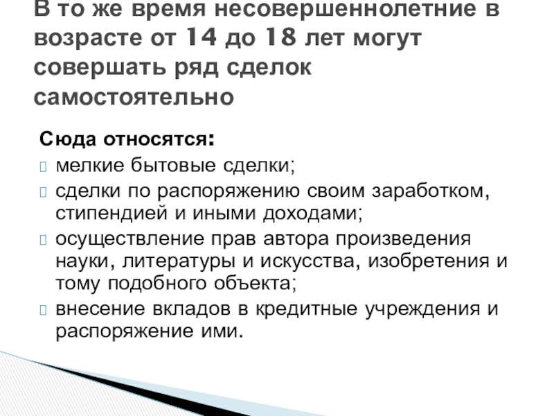 В то же время несовершеннолетние в возрасте от 14 до 18 лет могут совершать ряд сделок самостоятельно