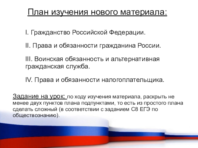Задание на урок: по ходу изучения материала, раскрыть не менее двух пунктов плана подпунктами, то есть из простого плана сделать сложный (в соответствии с заданием С8 ЕГЭ по обществознанию).