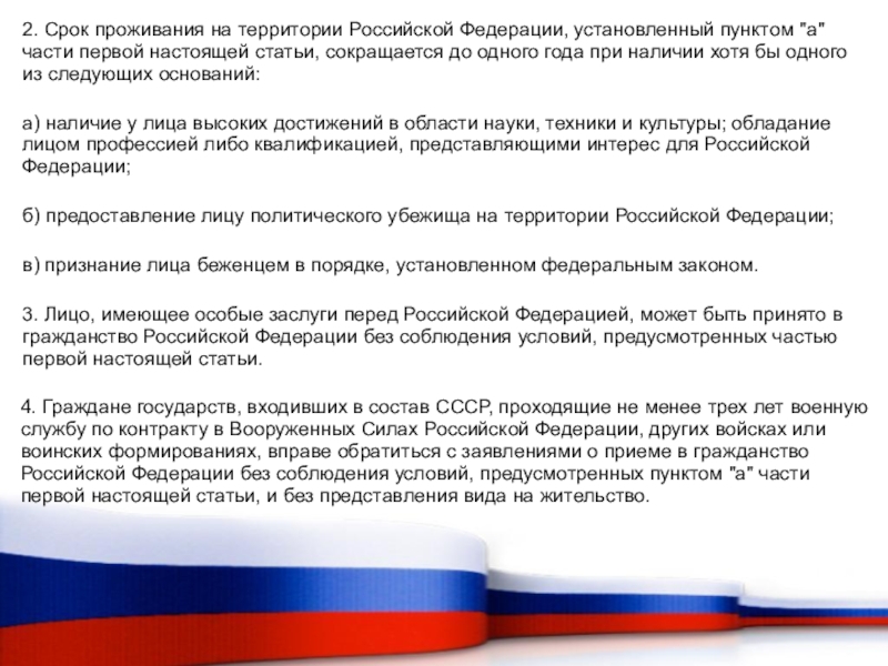 4. Граждане государств, входивших в состав СССР, проходящие не менее трех лет военную службу по контракту в Вооруженных Силах Российской Федерации, других войсках или воинских формированиях, вправе обратиться с заявлениями о приеме в гражданство Российской Федерации без соблюдения условий, предусмотренных пунктом "а" части первой настоящей статьи, и без представления вида на жительство.