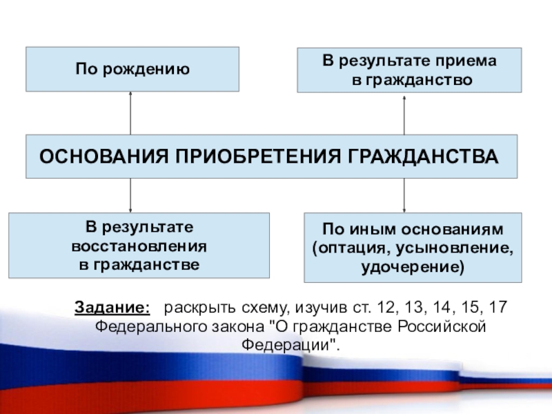 Задание: раскрыть схему, изучив ст. 12, 13, 14, 15, 17 Федерального закона "О гражданстве Российской Федерации".