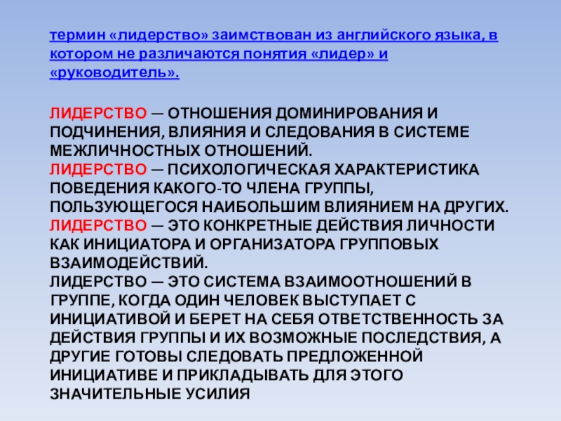 термин «лидерство» заимствован из английского языка, в котором не различаются понятия «лидер» и «руководитель».