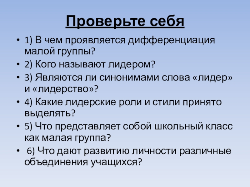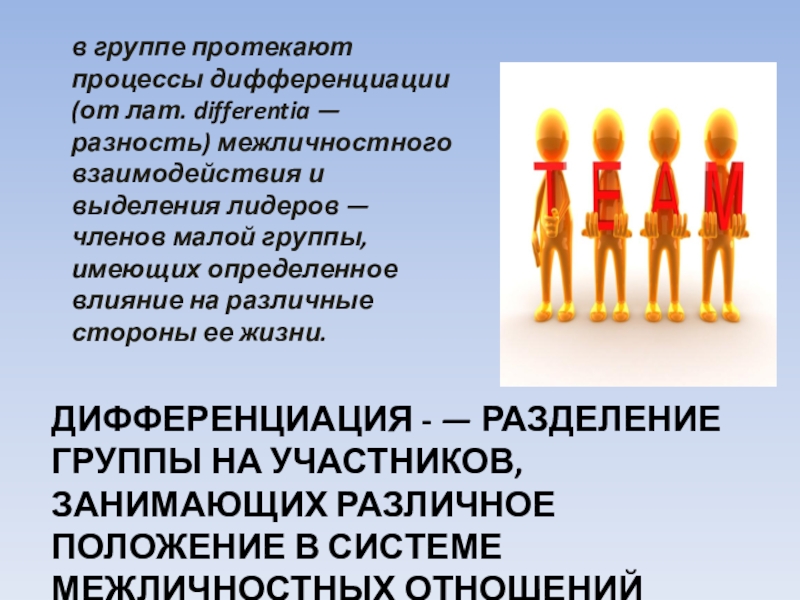 в группе протекают процессы дифференциации (от лат. differentia — разность) межличностного взаимодействия и выделения лидеров — членов малой группы, имеющих определенное влияние на различные стороны ее жизни.