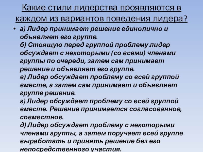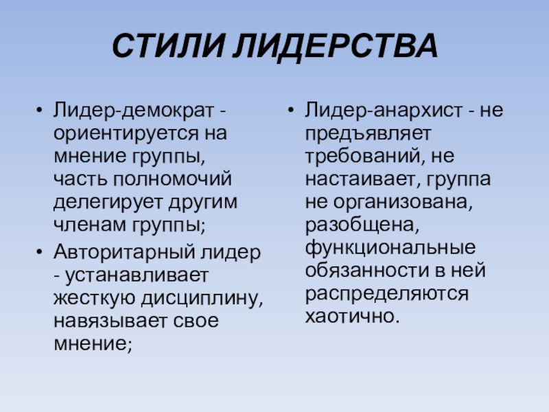 Лидер-анархист - не предъявляет требований, не настаивает, группа не организована, разобщена, функциональные обязанности в ней распределяются хаотично.