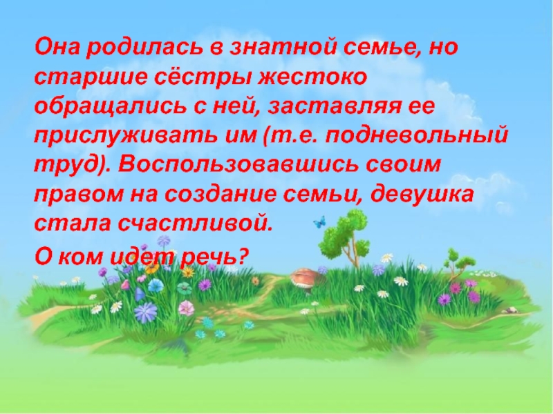 ней, заставляя ее прислуживать им (т.е. подневольный труд). Воспользовавшись своим правом на создание семьи, девушка стала счастливой.