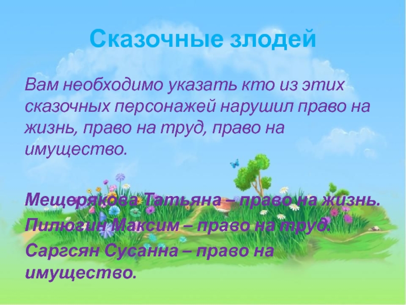 Сказочные злодейВам необходимо указать кто из этих сказочных персонажей нарушил право на жизнь, право на труд, право