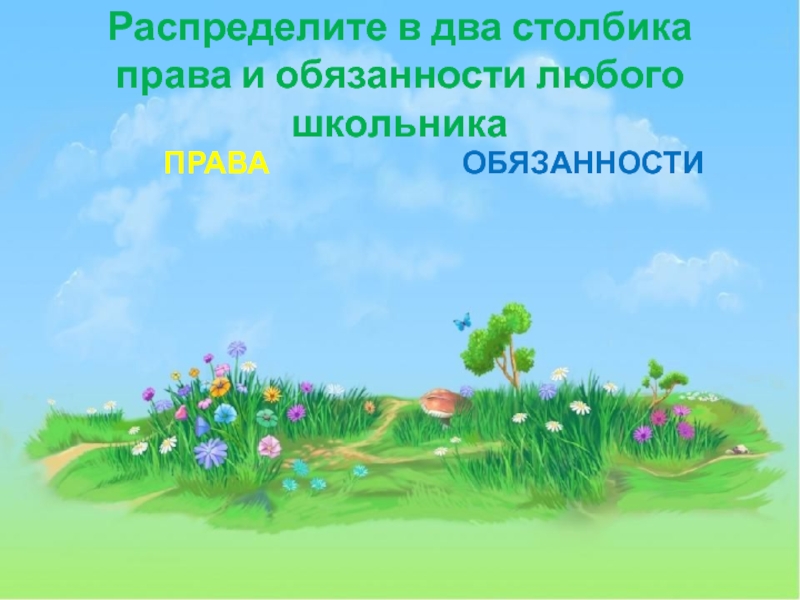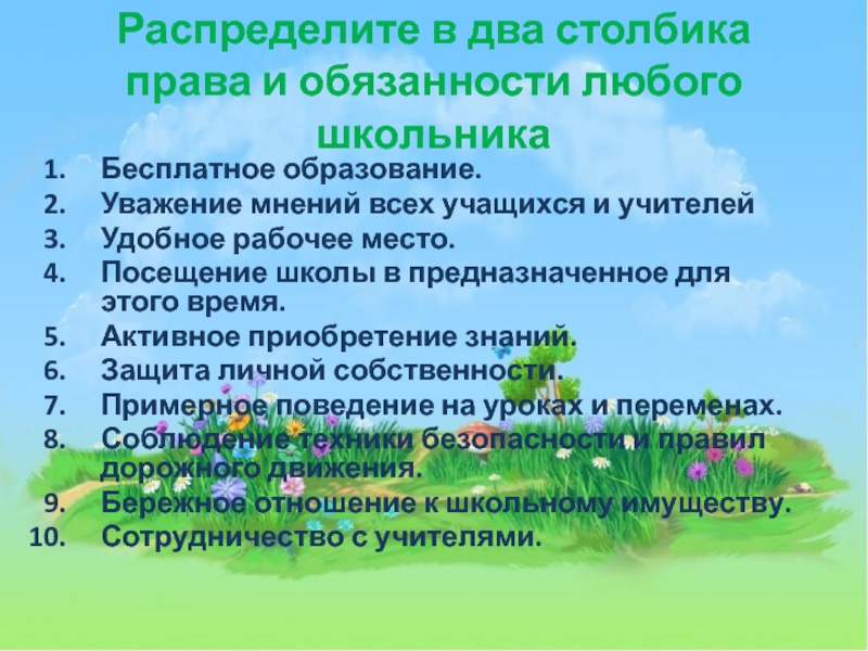 Слайд 6Распределите в два столбика права и обязанности любого школьника