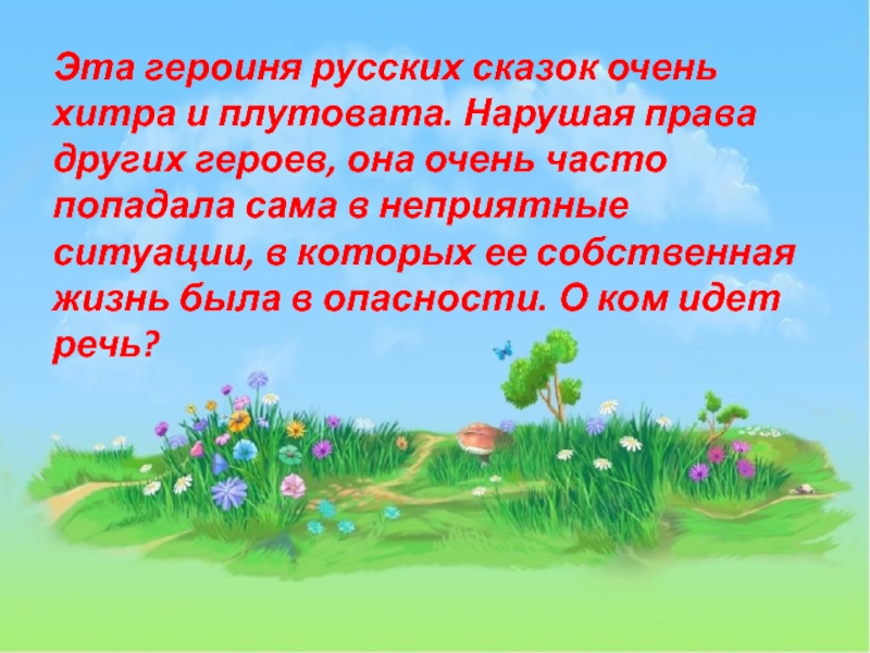 Слайд 26Эта героиня русских сказок очень хитра и плутовата. Нарушая права других