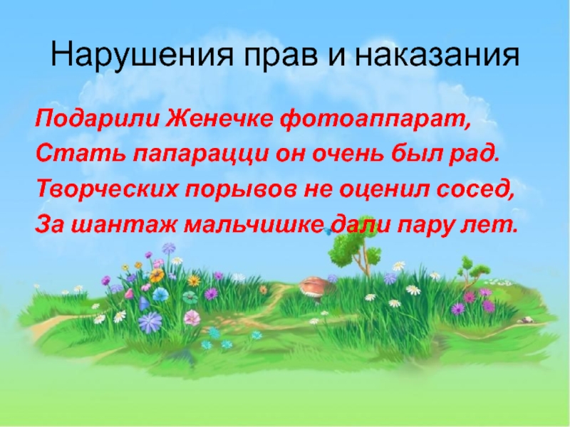 Нарушения прав и наказанияПодарили Женечке фотоаппарат,Стать папарацци он очень был рад.Творческих порывов не оценил сосед,За шантаж мальчишке
