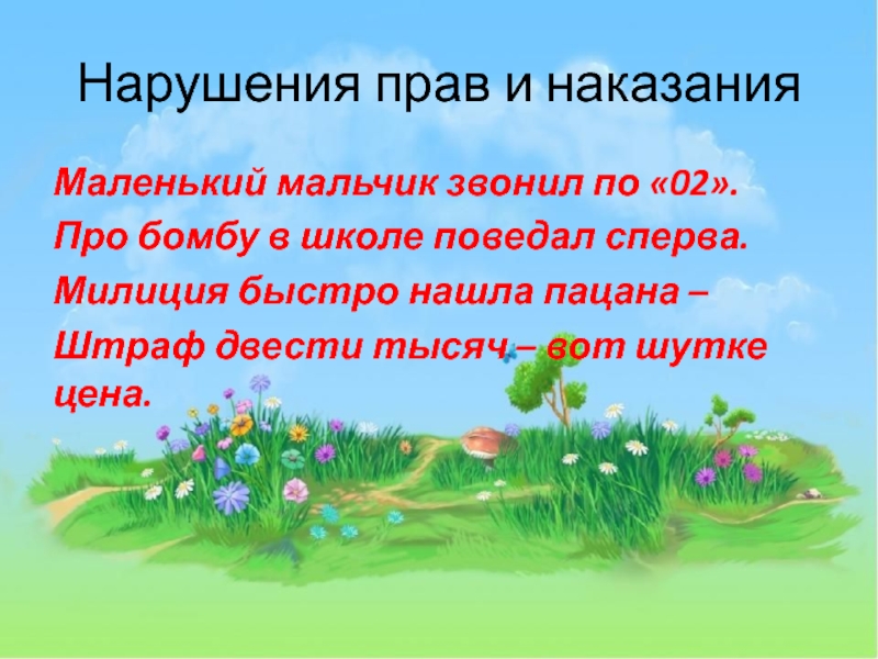 Нарушения прав и наказанияМаленький мальчик звонил по «02».Про бомбу в школе поведал сперва.Милиция быстро нашла пацана –