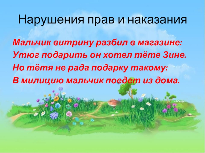 Нарушения прав и наказанияМальчик витрину разбил в магазине:Утюг подарить он хотел тёте Зине.Но тётя не рада подарку такому:В милицию мальчик поедет из дома.