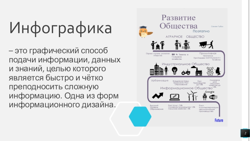 Инфографика– это графический способ подачи информации, данных и знаний, целью которого является быстро и чётко преподносить сложную информацию. Одна из форм информационного дизайна.