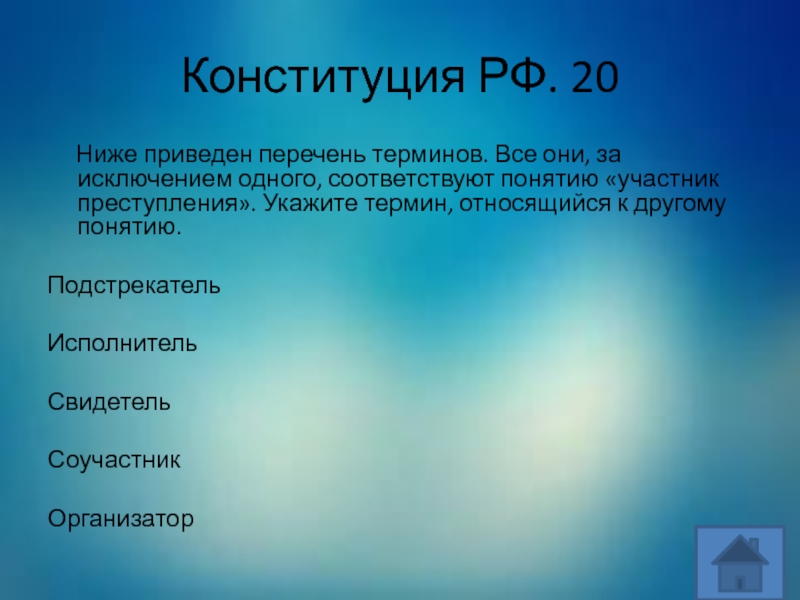 за исключением одного, соответствуют понятию «участник преступления». Укажите термин, относящийся к другому понятию.