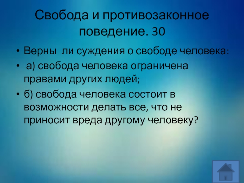 б) свобода человека состоит в возможности делать все, что не приносит вреда другому человеку?