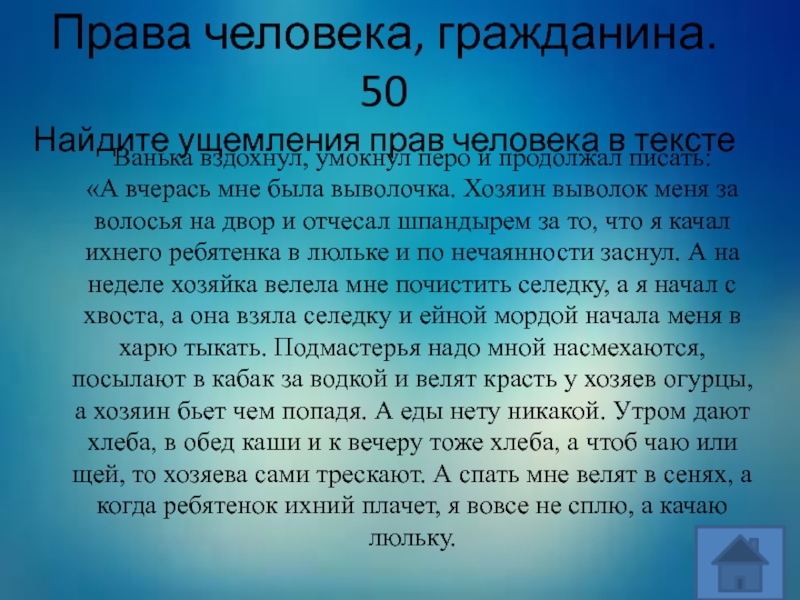 «А вчерась мне была выволочка. Хозяин выволок меня за волосья на двор и отчесал шпандырем за то, что я качал ихнего ребятенка в люльке и по нечаянности заснул. А на неделе хозяйка велела мне почистить селедку, а я начал с хвоста, а она взяла селедку и ейной мордой начала меня в харю тыкать. Подмастерья надо мной насмехаются, посылают в кабак за водкой и велят красть у хозяев огурцы, а хозяин бьет чем попадя. А еды нету никакой. Утром дают хлеба, в обед каши и к вечеру тоже хлеба, а чтоб чаю или щей, то хозяева сами трескают. А спать мне велят в сенях, а когда ребятенок ихний плачет, я вовсе не сплю, а качаю люльку.