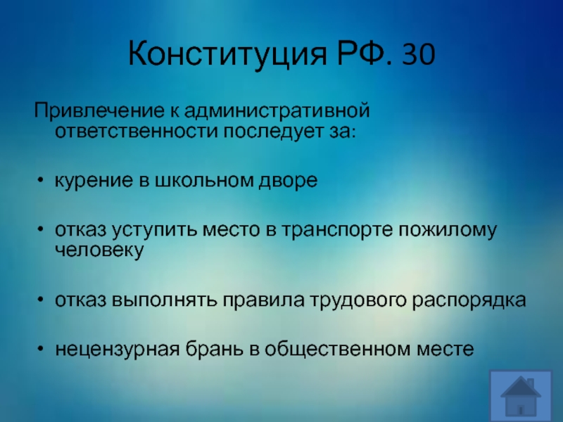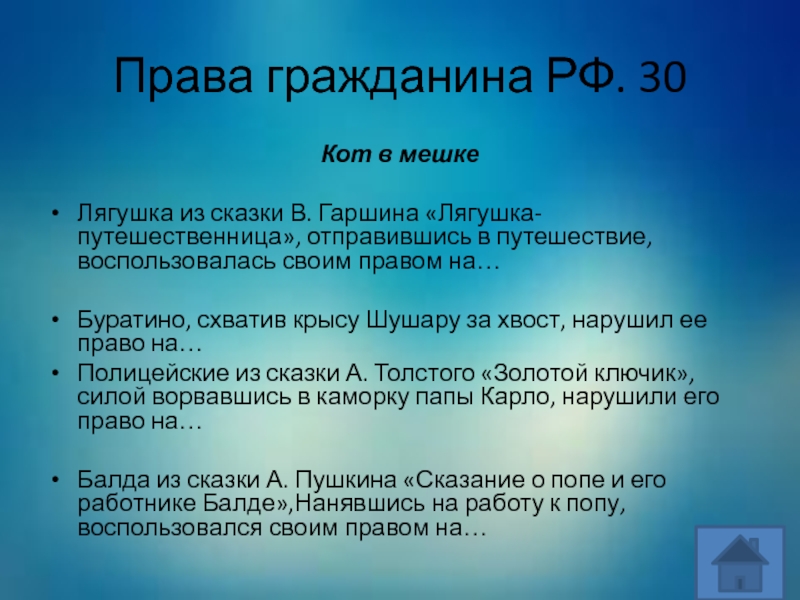 Полицейские из сказки А. Толстого «Золотой ключик», силой ворвавшись в каморку папы Карло, нарушили его право на…