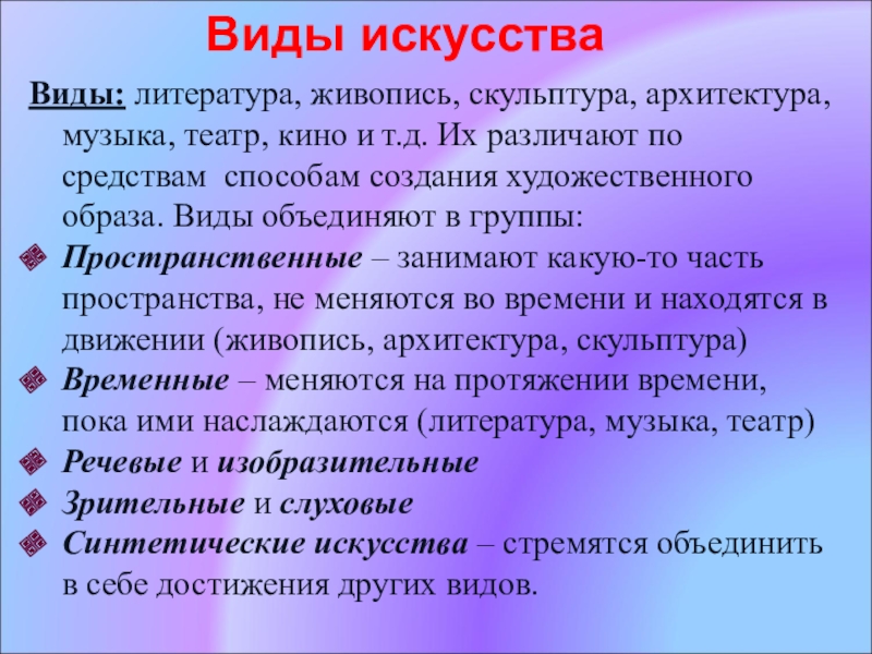 КЛАССИФИКАЦИИ: 1. ПРОСТРАНСТВЕННЫЕ ИЛИ ПЛАСТИЧНЫЕ- АРХИТЕКТУРА, ИЗОБРАЗИТЕЛЬНОЕ ИСКУССТВО.