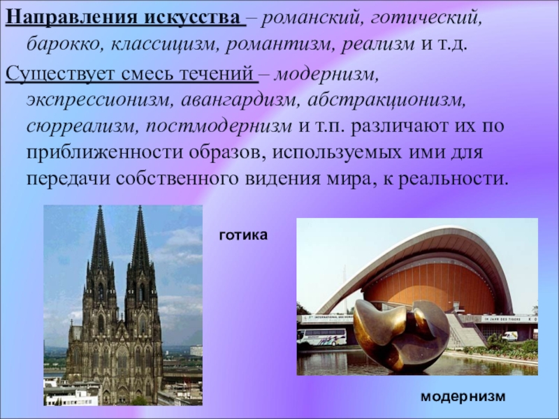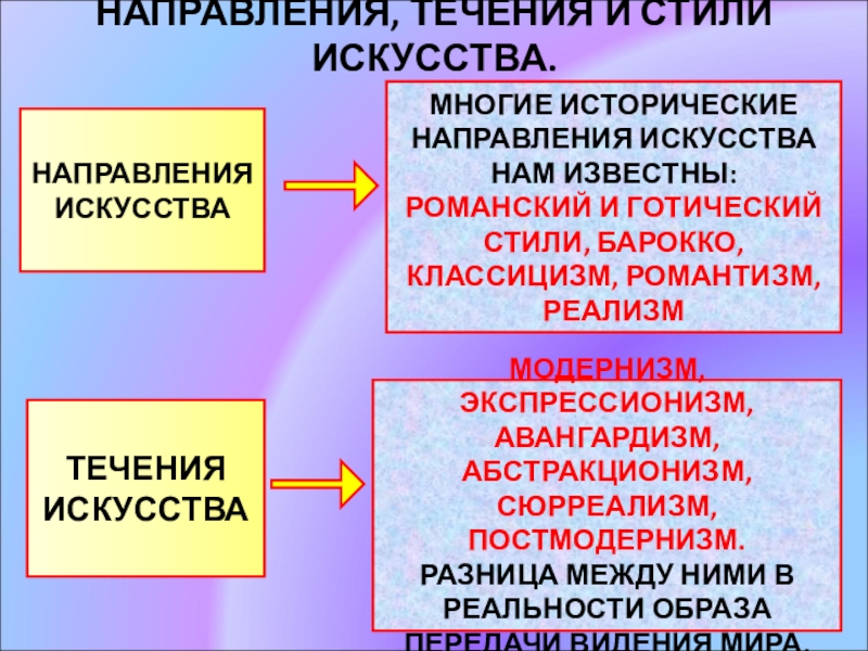 МОДЕРНИЗМ, ЭКСПРЕССИОНИЗМ, АВАНГАРДИЗМ, АБСТРАКЦИОНИЗМ, СЮРРЕАЛИЗМ, ПОСТМОДЕРНИЗМ.