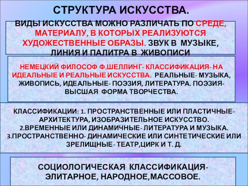НЕМЕЦКИЙ ФИЛОСОФ Ф.ШЕЛЛИНГ- КЛАССИФИКАЦИЯ- НА ИДЕАЛЬНЫЕ И РЕАЛЬНЫЕ ИСКУССТВА. РЕАЛЬНЫЕ- МУЗЫКА, ЖИВОПИСЬ, ИДЕАЛЬНЫЕ- ПОЭЗИЯ, ЛИТЕРАТУРА. ПОЭЗИЯ- ВЫСШАЯ ФОРМА ТВОРЧЕСТВА.