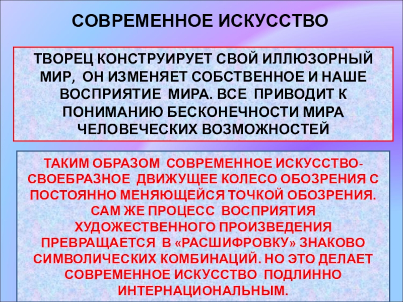 ТАКИМ ОБРАЗОМ СОВРЕМЕННОЕ ИСКУССТВО- СВОЕБРАЗНОЕ ДВИЖУЩЕЕ КОЛЕСО ОБОЗРЕНИЯ С ПОСТОЯННО МЕНЯЮЩЕЙСЯ ТОЧКОЙ ОБОЗРЕНИЯ. САМ ЖЕ ПРОЦЕСС ВОСПРИЯТИЯ ХУДОЖЕСТВЕННОГО ПРОИЗВЕДЕНИЯ ПРЕВРАЩАЕТСЯ В «РАСШИФРОВКУ» ЗНАКОВО СИМВОЛИЧЕСКИХ КОМБИНАЦИЙ. НО ЭТО ДЕЛАЕТ СОВРЕМЕННОЕ ИСКУССТВО ПОДЛИННО ИНТЕРНАЦИОНАЛЬНЫМ.