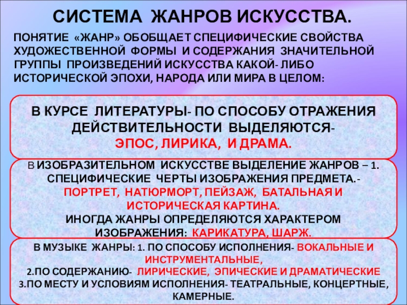 В ИЗОБРАЗИТЕЛЬНОМ ИСКУССТВЕ ВЫДЕЛЕНИЕ ЖАНРОВ – 1.СПЕЦИФИЧЕСКИЕ ЧЕРТЫ ИЗОБРАЖЕНИЯ ПРЕДМЕТА.- ПОРТРЕТ, НАТЮРМОРТ, ПЕЙЗАЖ, БАТАЛЬНАЯ И ИСТОРИЧЕСКАЯ КАРТИНА.