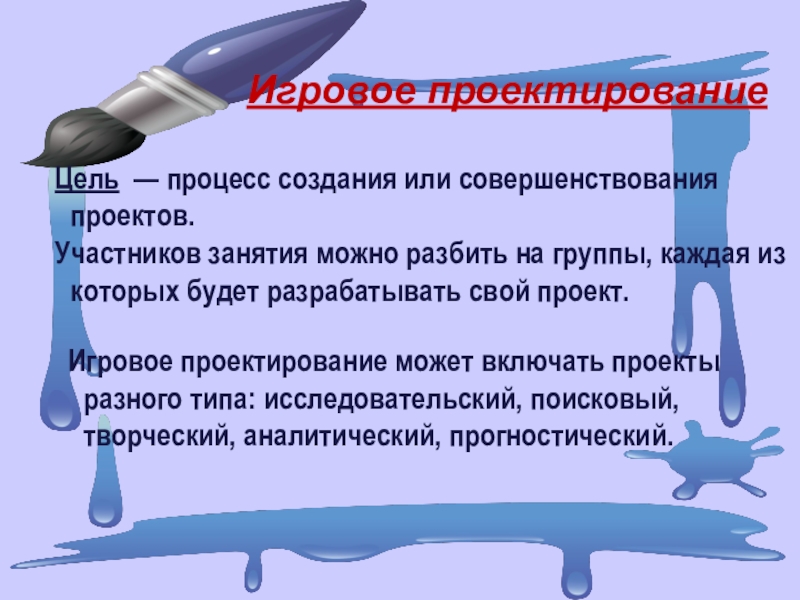 Игровое проектирование может включать проекты разного типа: исследовательский, поисковый, творческий, аналитический, прогностический.