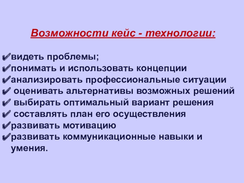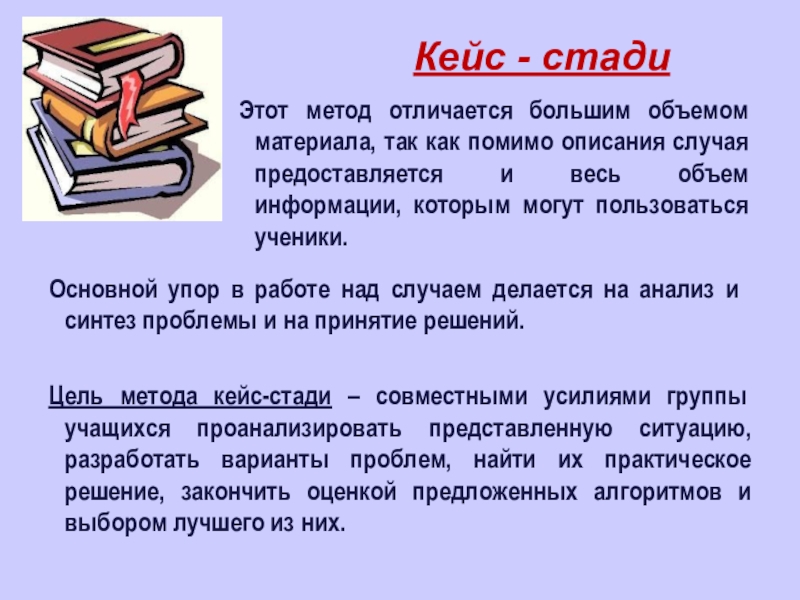 Основной упор в работе над случаем делается на анализ и синтез проблемы и на принятие решений.