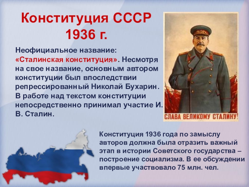 Конституция 1936 года по замыслу авторов должна была отразить важный этап в истории Советского государства – построение социализма. В ее обсуждении впервые участвовало 75 млн. чел.