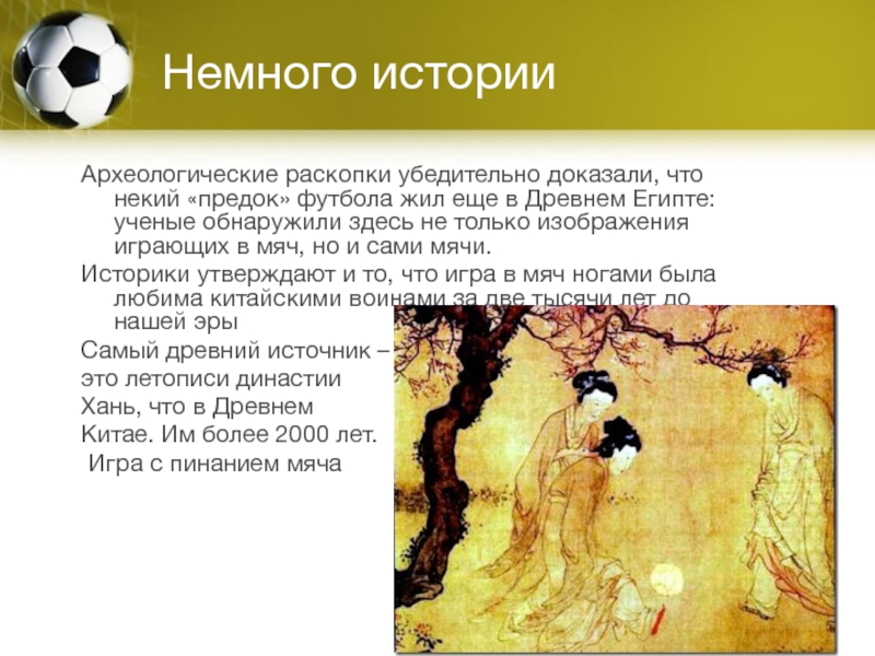 Немного историиАрхеологические раскопки убедительно доказали, что некий «предок» футбола жил еще в Древнем Египте: ученые обнаружили здесь не только изображения играющих в мяч, но и сами мячи.Историки утверждают и то, что игра в мяч ногами была любима китайскими