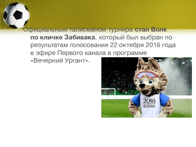 Официальным талисманом турнира стал Волк по кличке Забивака, который был выбран