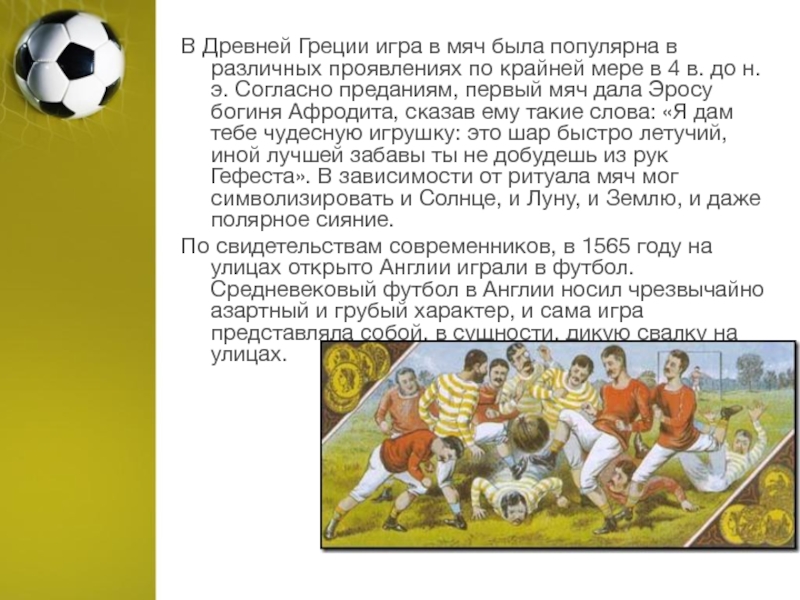 В Древней Греции игра в мяч была популярна в различных проявлениях по крайней мере в 4 в. до н.