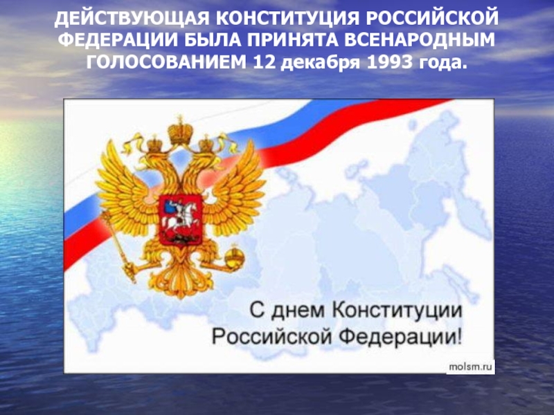 Слайд 9ДЕЙСТВУЮЩАЯ КОНСТИТУЦИЯ РОССИЙСКОЙ ФЕДЕРАЦИИ БЫЛА ПРИНЯТА ВСЕНАРОДНЫМ ГОЛОСОВАНИЕМ 12 декабря 1993