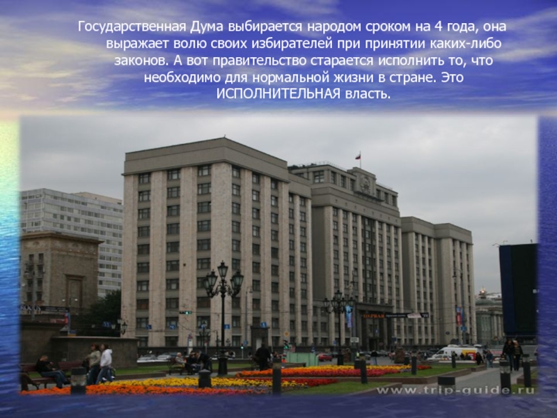 Слайд 16 Государственная Дума выбирается народом сроком на 4 года, она выражает волю