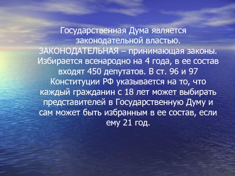 на 4 года, в ее состав входят 450 депутатов. В ст. 96 и 97 Конституции РФ указывается на то, что каждый гражданин с 18 лет может выбирать представителей в Государственную Думу и сам может быть избранным в ее состав, если ему 21 год.
