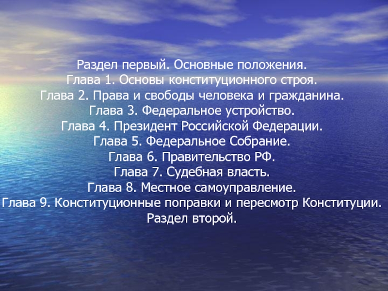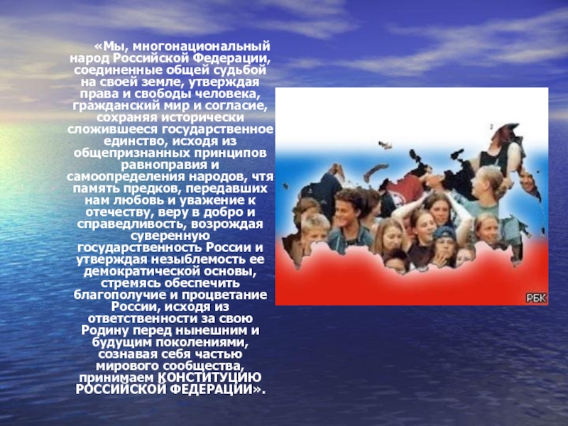 утверждая права и свободы человека, гражданский мир и согласие, сохраняя исторически сложившееся государственное единство, исходя из общепризнанных принципов равноправия и самоопределения народов, чтя память предков, передавших нам любовь и уважение к отечеству, веру в добро и справедливость, возрождая суверенную государственность России и утверждая незыблемость ее демократической основы, стремясь обеспечить благополучие и процветание России, исходя из ответственности за свою Родину перед нынешним и будущим поколениями, сознавая себя частью мирового сообщества, принимаем КОНСТИТУЦИЮ РОССИЙСКОЙ ФЕДЕРАЦИИ».