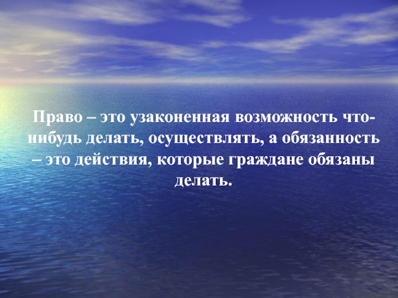 Слайд 23Право – это узаконенная возможность что-нибудь делать, осуществлять, а обязанность –