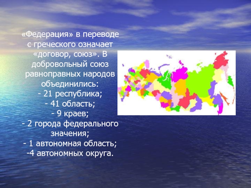 Слайд 12«Федерация» в переводе с греческого означает «договор, союз». В добровольный союз