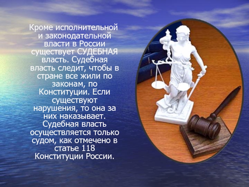 Кроме исполнительной и законодательной власти в России существует СУДЕБНАЯ власть. Судебная