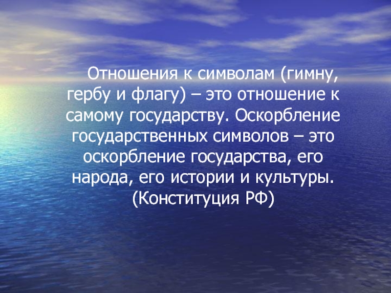 самому государству. Оскорбление государственных символов – это оскорбление государства, его народа, его истории и культуры. (Конституция РФ)